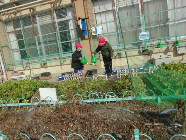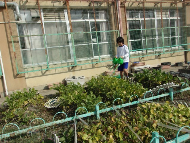 体育科の学習の後には、水やりを行いました。あまり雨が降っていなかったので、今回はたっぷり水をあげました。まだまだダイコン、カブは植わっているので、今後も楽しみです。