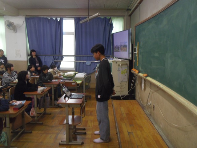 Unit7の最後の授業です。6年生の子どもたちは5年生に小学校での一番の思い出を紹介しました。