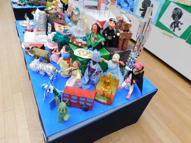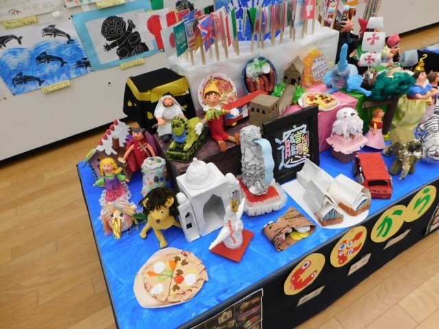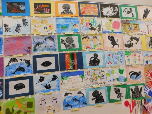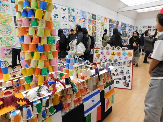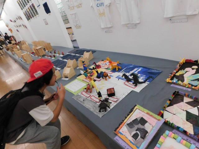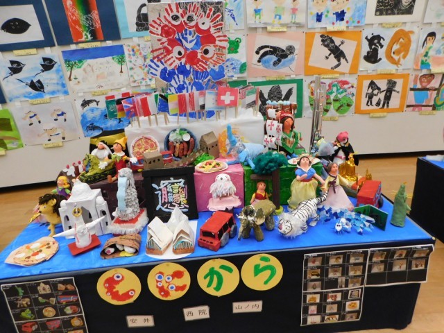 2階では小学校の作品が飾られていました。自分たちがつくった平面作品、立体作品を見ました。立体作品の今年度の右京南支部のテーマは「せかいのくにからこんにちは」。たくさんの作品を見ることができました。その他の支部の作品も見て回りました。子どもたちは興味深く、他の支部の作品を見ていました。1階には主に中学校の作品が飾られていました。「西院中学校の作品はどこ?」「あった!」と言いながら、以前、一緒に学習した友達の作品を鑑賞する姿が見られました。