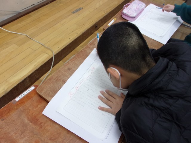 百人一首をしたあと、討論会をしました。今回のテーマは、「小学校のおひるごはんは給食かお弁当が良いか」。このテーマは以前、このチームで討論会をしたときに話した内容でもありました。今回は、討論会をしたあとに、見本を見ながら意見文を書きました。話すだけでなく書くことについても頑張って取り組んでいます。