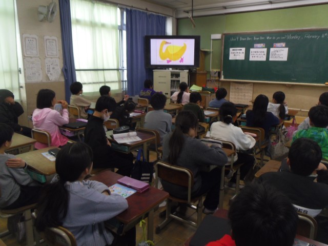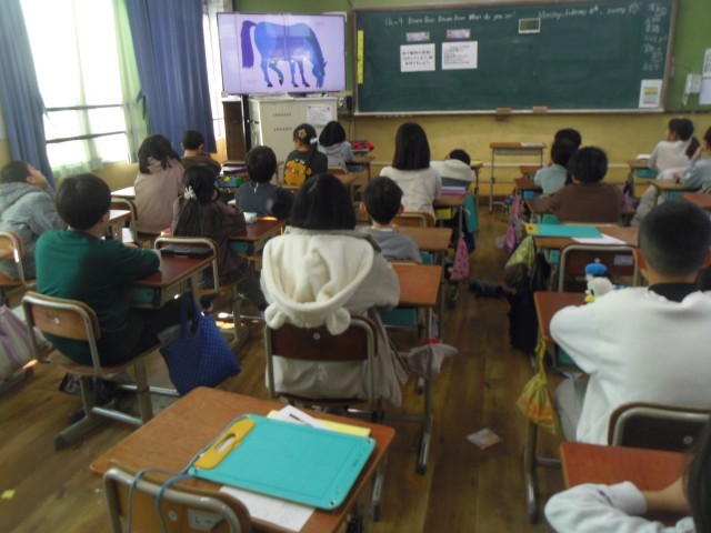 Unit9の2回目の学習をしました。子どもたちははじめに絵本の読み聞かせを聞きました。