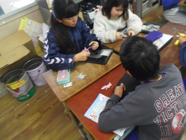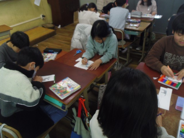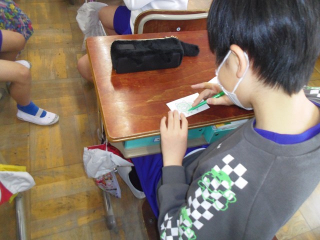 授業の後半には各自で絵本作りの続きを行いました。動物と色を決めて色をぬりました。