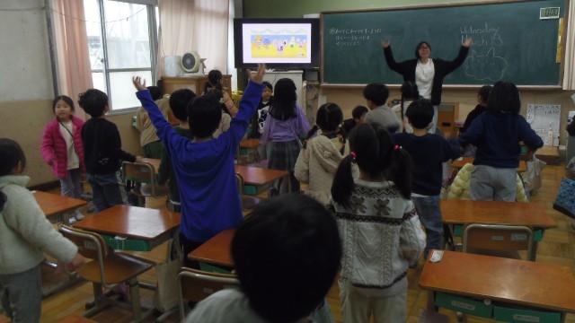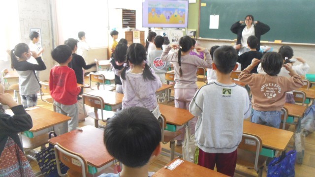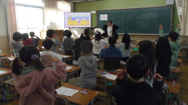 Unit2の4回目の授業をしました。今日はALTの先生、英語専科の先生と一緒に学習しました。はじめに歌を歌いました。