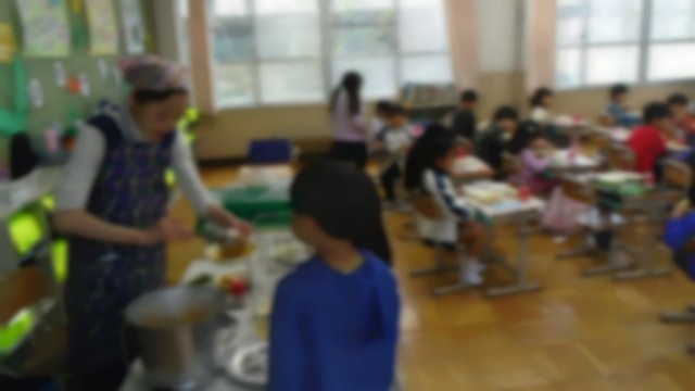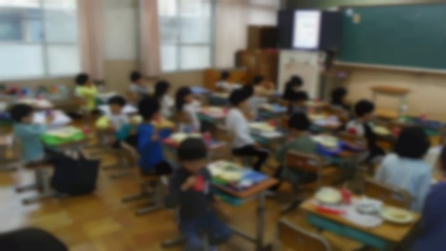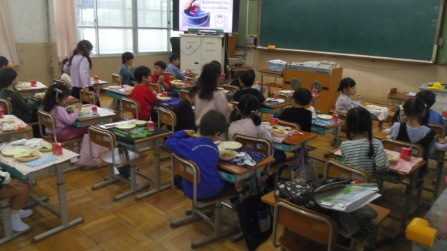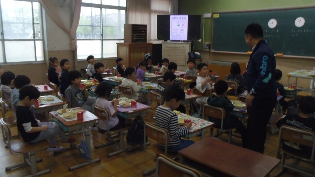 1年生の子どもたちは初めての給食です。しっかり味わって食べました。校長先生が子どもたちの様子を見に来ました。