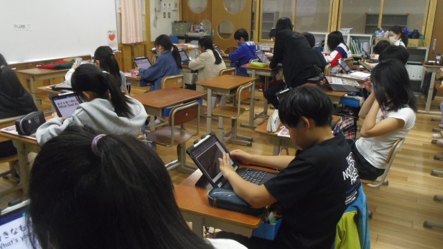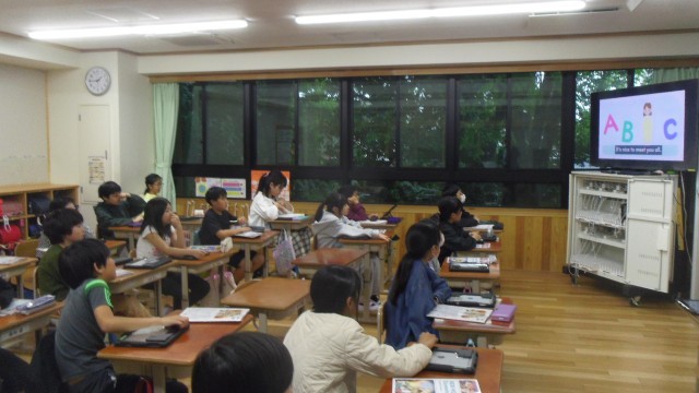 Unit1の5時間目の授業をしました。はじめの歌はしっかり歌えるようになってきています。さすが6年生です。歌の次に各自のタブレットを使って宝物や好きなもの等の言い方、たずね方の練習をしました。