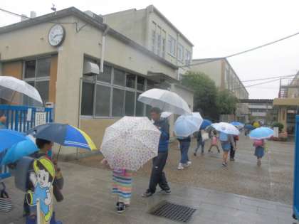運動会が中止となった雨天の中も,子どもたちは少し残念そうな顔をしながらも,元気な姿で登校しています。