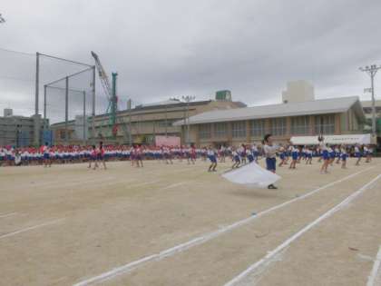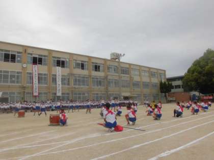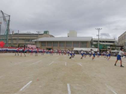 まずは,お互いの健闘をたたえ合って,応援団が中心となってエール交換を行いました。練習してきた成果が発揮され,大きな声とダイナミックな振り付けで大いに盛り上げることができました。