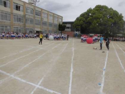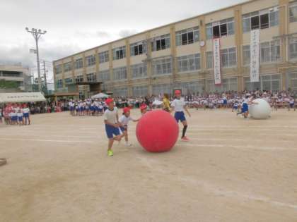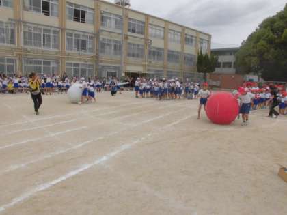 1年生と6年生が力を合わせて大きな玉をコロコロ転がしました。6年生が1年生をうまくサポートすることができ,とても楽しそうに競技をしていました。