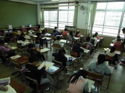 3年1組では,算数の勉強をしていました。2年生で学習した掛け算について,真剣な表情でプリントの問題に向き合っていました。