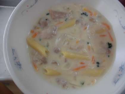 今日の給食のメニューは,「チキンとペンネのクリームに」「スープ」「あじつけコッペパン」「ぎゅうにゅう」でした。新献立の「チキンとペンネのクリーム煮」は,柔らかくクリーミーでとてもおいしく感じました。