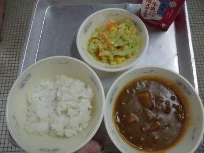 今日の給食の献立は,「野菜のソテー」「カレー」「ごはん」「ぎゅうにゅう」でした。カレーは,味に深みがありとてもおいしく感じました。
