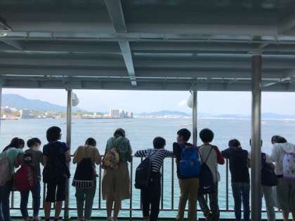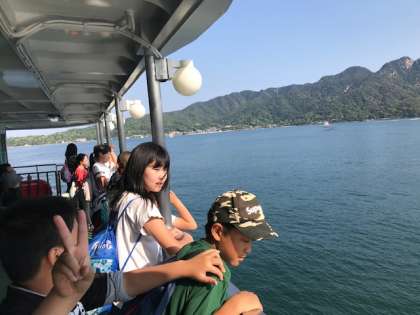 ほぼ予定通り16:00に宮島口桟橋に集合することができました。ここから船で宮島に渡ります。出発時の京都市の天候は曇りでしたが,広島は晴れの天気です。海からの風は,ちょっぴり冷たくで気持ちいいです。