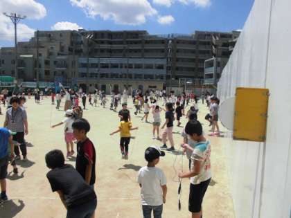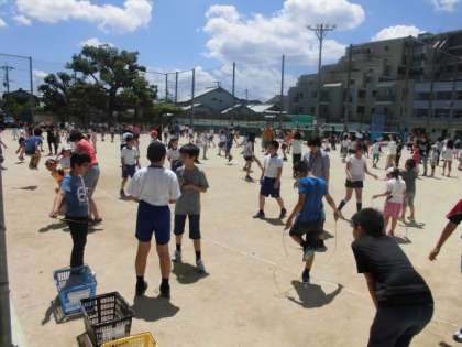 山ノ内小学校では,中間休みの終了間際から5分間,なわとび月間の取り組みを行っています。縄跳びの楽しさを感じてほしいと思います。