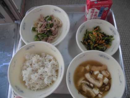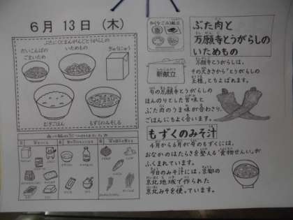 今日の給食の献立は,「だいこんばのごまいため」「ぶたにくとまんがんじとうがらしのいためもの」「もずくのみそしる」「むぎごはん」「ぎゅうにゅう」でした。「ぶたにくとまんがんじとうがらしのいためもの」は,新献立でした。