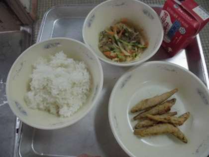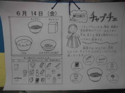今日の給食の献立は,「チャプチェ」「わかさぎのからあげ」「ごはん」「ぎゅうにゅう」でした。チャプチェとは韓国・朝鮮の家庭料理の一つで,つるりとした食感があり,春雨が野菜と肉の旨みをたっぷり吸って,とてもおいしく感じました。