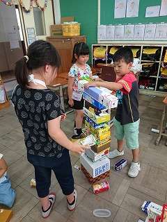 家から持ってきた箱がたくさん集まってきたので,どんなことができそうかなと考えました。今日は,箱を積んだり並べたりして楽しみました。最後に,友達がどんなことをしていたか,見て回ると,