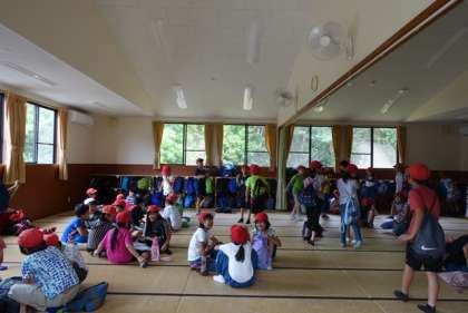 バスは,予定通り12時にみさきの家に到着しました。子どもたちは,60畳の部屋に荷物を置いて次の活動の準備をしました。
