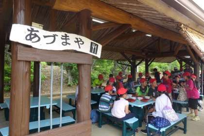 次の活動に向けて荷物の整理後は,あずまやでの昼食でした。屋外での食事では,心地よい風が,食事を一層おいしく感じさせてくれました。