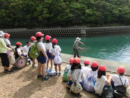 午後の活動は,まず,かご漁の仕掛けについて話を聞きました。かかってほしい魚を各班ごとに決めて,担任の先生がかごを深谷水道に投げ入れました。