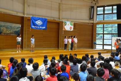 京都市内の別の小学校との合同で「朝の集い」が行われました。お互いの校歌や学校紹介をし,交流を深めました。