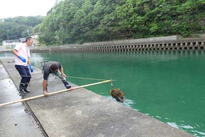 かごを力いっぱい引き上げました。最後は,みさきの家の職員の方にお願いしました。