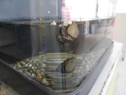 タニシは新しい水槽が気に入ったのか,昨日よりも元気に動いていました。理科室の前に水槽を置いているので,学校に来た時には是非見に来てください。