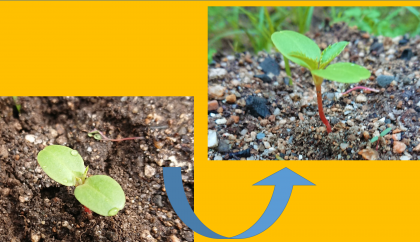 今日のホウセンカとヒマワリの様子です。子葉(しよう…一番はじめに出る葉)とちがう形の葉が出てきましたよ。しゃしんを見てくらべてみてね。