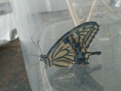 5月から育てていたアゲハチョウが羽化しました。モンシロチョウとくらべると,とても大きいです。Aグループの人は,今日,見てくれましたか?口もとにストローのようなクルクルしたものや,足のよう子,しょっかくがよく見えますよ!Bグループの人は,ろうかに置いておくので,明日,見てくださいね。学校でまってます。