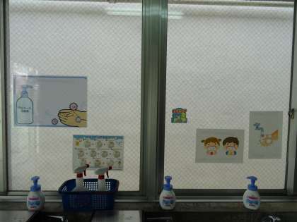 手洗い場にて,アルコール消毒をします。