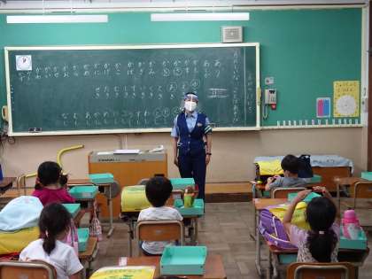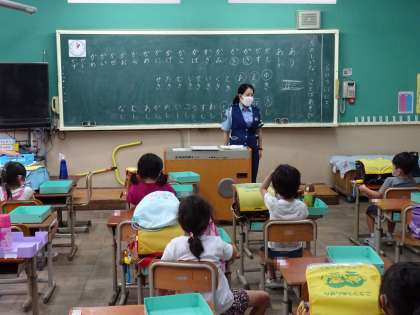 京都府警察右京警察署交通課のみなさんが,安全指導に来てくださいました。道の渡り方など,分かりやすいお話でした。
