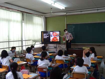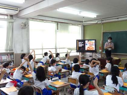 新しいALTの先生と学習をしました。先生の育った国や好きな食べ物などを知りました。