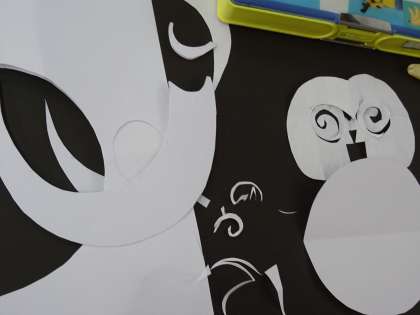 切った形を見たり並べたりして,表したいことを見付けてのりで貼ったり,さらに切り足したり,貼り足したりして題名を考えました。