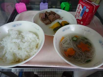 七夕そうめんは,そうめんを天の川に,オクラを星に見立ててつくりました。子どもたちは,そうめんのさらさらした食感やかぼちゃの甘味を味わいながら食べていました。