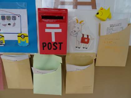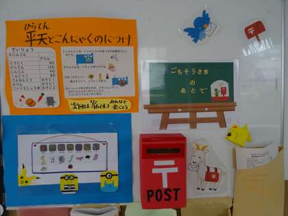 ふれあいサロン前の給食ポストの周りに,人気メニューについてのお知らせを置いています。