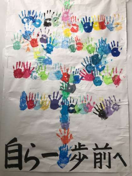 子ども達の手形を合わせて「幸」の文字ををつくりました。幸せに向かって,一歩踏み出せるよう,共に過ごしていきたいと思います!