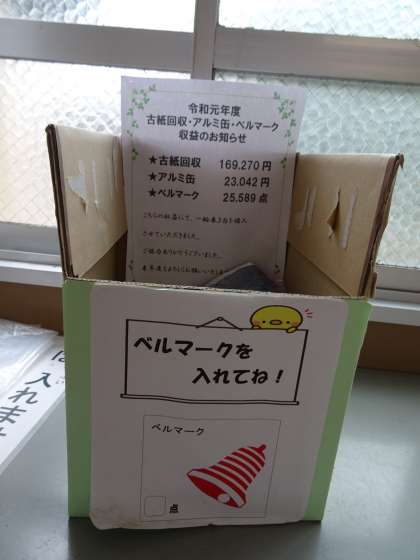 職員室前にベルマーク回収箱を設置しています。毎年,集めたベルマークでいろいろな物を購入しています。回収に,ご協力よろしくお願いいたします。