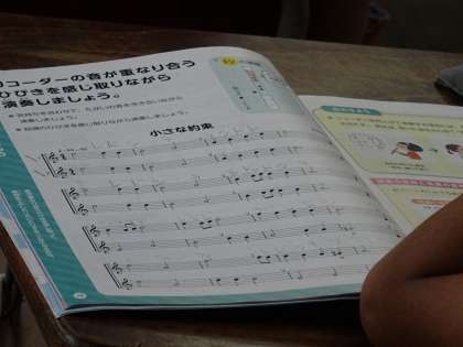 「小さな約束」の範奏を聴いて,旋律の特徴を感じ取ったり,音が重なり合う響きを聴き取ったりして演奏しました。