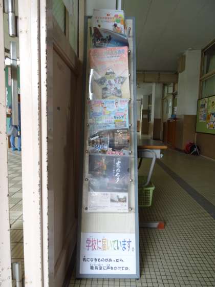 玄関前には,広告などを置いています。興味のあるものがあれば,お持ち帰りください。