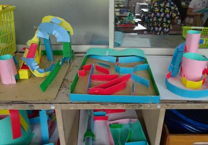 ビー玉が転がる仕組みを考え,グループの考えに合った形や色,材料などを工夫してつくりました。
