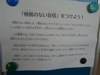 校長室前の掲示板です。自信についての子どもたちへのメッセージです。