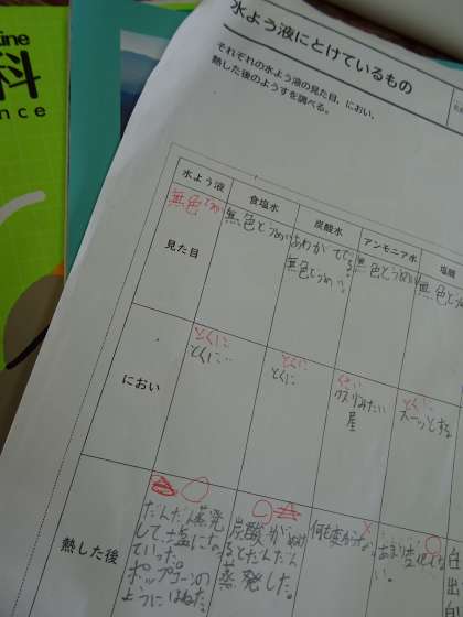 それぞれの水溶液を見たり,においを調べたりして,気付いたことを話し合いました。