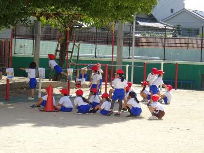 ぶら下がる,ふる,上がる,下りる,つたうなど,教師が示したいろいろな動きや遊びに挑戦しました。