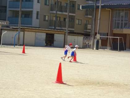 おりかえりリレーの仕方を知り,走る順番やバトンパスの仕方を工夫して,相手チームと競走することを楽しみました。