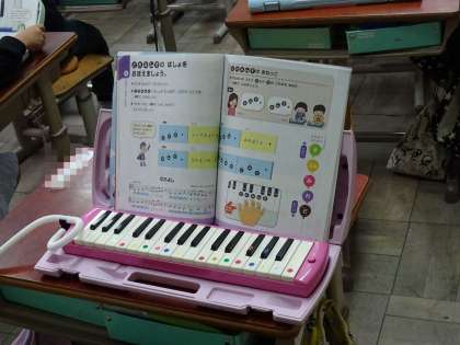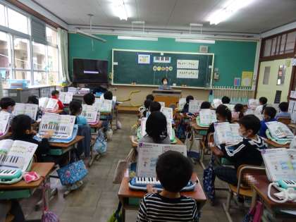 音の高さを確かめながら,鍵盤ハーモニカで「どれみであいさつ」を演奏しました。