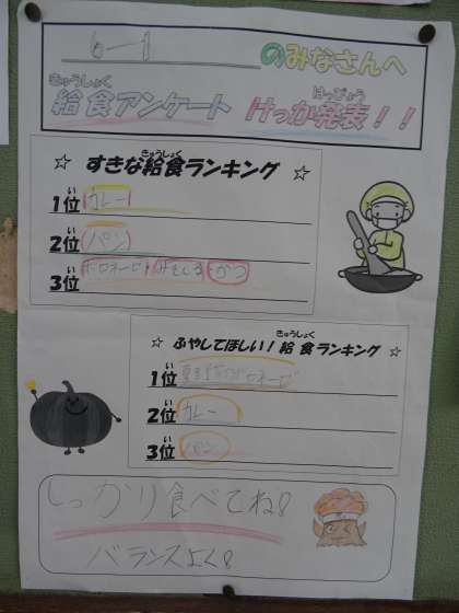 6年生の給食アンケートです。第1位はカレーでした。