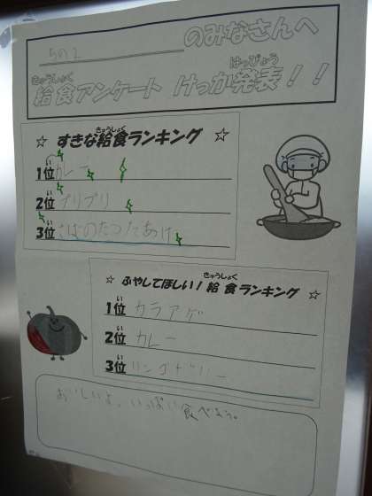 5年生の給食アンケートです。カレーを破り,第1位に輝いたのは,「からあげ」でした。