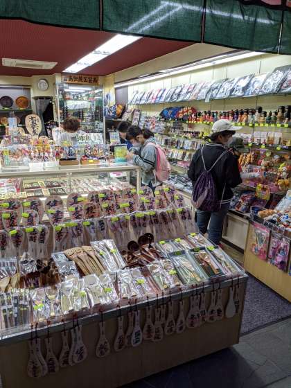 宮島で買い物を楽しんでいます。お土産選びに夢中です。