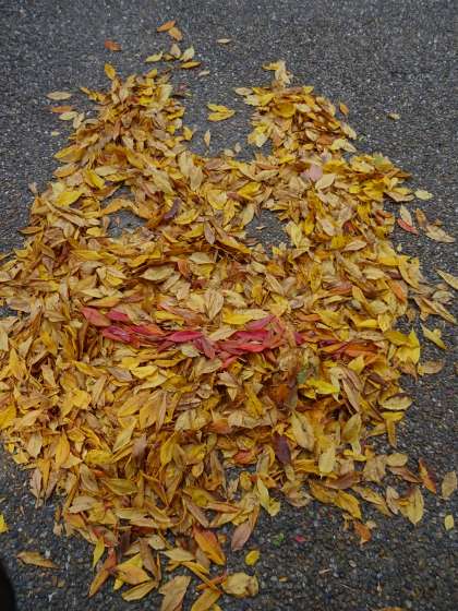校内の落ち葉を使って,低学年の児童が形づくりをしていました。