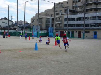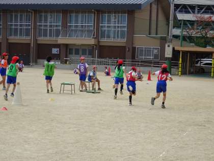 走る順番を工夫し,走りながらバトンパスをして相手チームと競走することを楽しみました。
