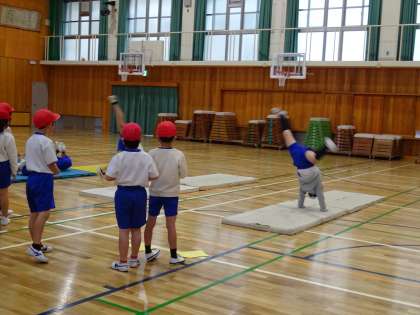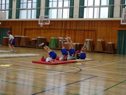 着手を意識したり,逆さ感覚をつかんだりするなど,マットを使った遊びに繋がる動きを中心に行いました。